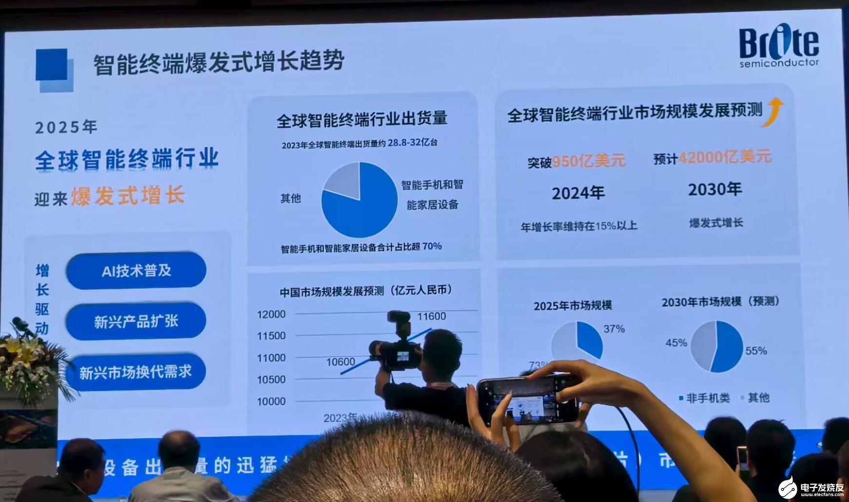 在近期举办的AIOT大会上,灿芯半导体(上海)股份有限公司市场总监杨凯分享智能终端市场的最新数据,2024年全球智能终端市场规模突破950亿美元,到2030年将达到42000亿美元,呈现爆发式增长。增长来自三大驱动力:一是AI技术普及;二是新兴产品扩张,三是新兴市场换代需求。