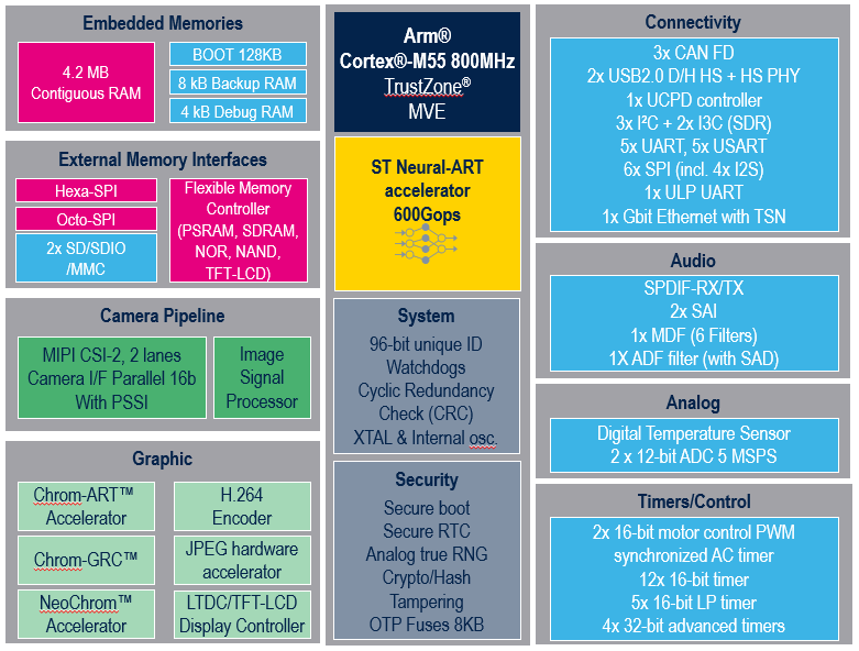 在核心芯片产品方面,STM32N6系列基于单核Arm? Cortex? M55,主频高达800 MHz,是STM32系列中速度最高的,并集成了Helium向量处理技术,实现了先进的数字信号处理(DSP)能力。该系列还独特地嵌入了意法半导体自主研发的Neural ART Accelerator? 神经网络处理单元(NPU),运行频率为1 GHz,性能高达600 GOPS,支持高效低功耗的实时AI推理,适用于视觉、音频及多模态任务。STM32N6配备专用的计算机视觉流水线,支持ISP和MIPI CSI 2接口,同时具备多媒体硬件功能,如H.264编码器、JPEG编解码器和NeoChrom 2.5D GPU,非常适合视频丰富且由AI驱动的应用场景。它提供4.2 MB连续SRAM和灵活的外部存储接口,并具备强大的安全特性,包括TrustZone、实时加密以及最高达SESIP 3/PSA L3的安全认证。总体而言,STM32N6是意法半导体首款高性能、AI加速的微控制器,专为边缘视觉、音频处理及安全实时嵌入式系统设计。
